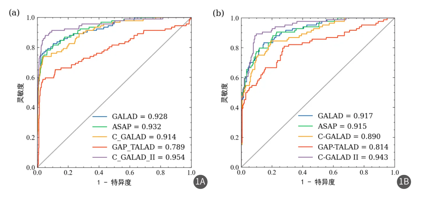 圖1 C-GALAD Ⅱ模型和已報道的4個風(fēng)險預(yù)測模型在測試集中和驗證集中對原發(fā)性肝細(xì)胞癌的診斷性能比較(1A 為測試集,1B為驗證集)