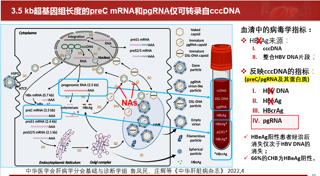 當(dāng)前常用的病毒學(xué)指標(biāo)HBsAg的來(lái)源除了cccDNA以外還有整合HBV DNA片段,只有3.5kb超基因組長(zhǎng)度的preC mRNA和pgRNA僅可轉(zhuǎn)錄自cccDNA,因而能反映cccDNA的指標(biāo)為pgRNA和HBcrAg。