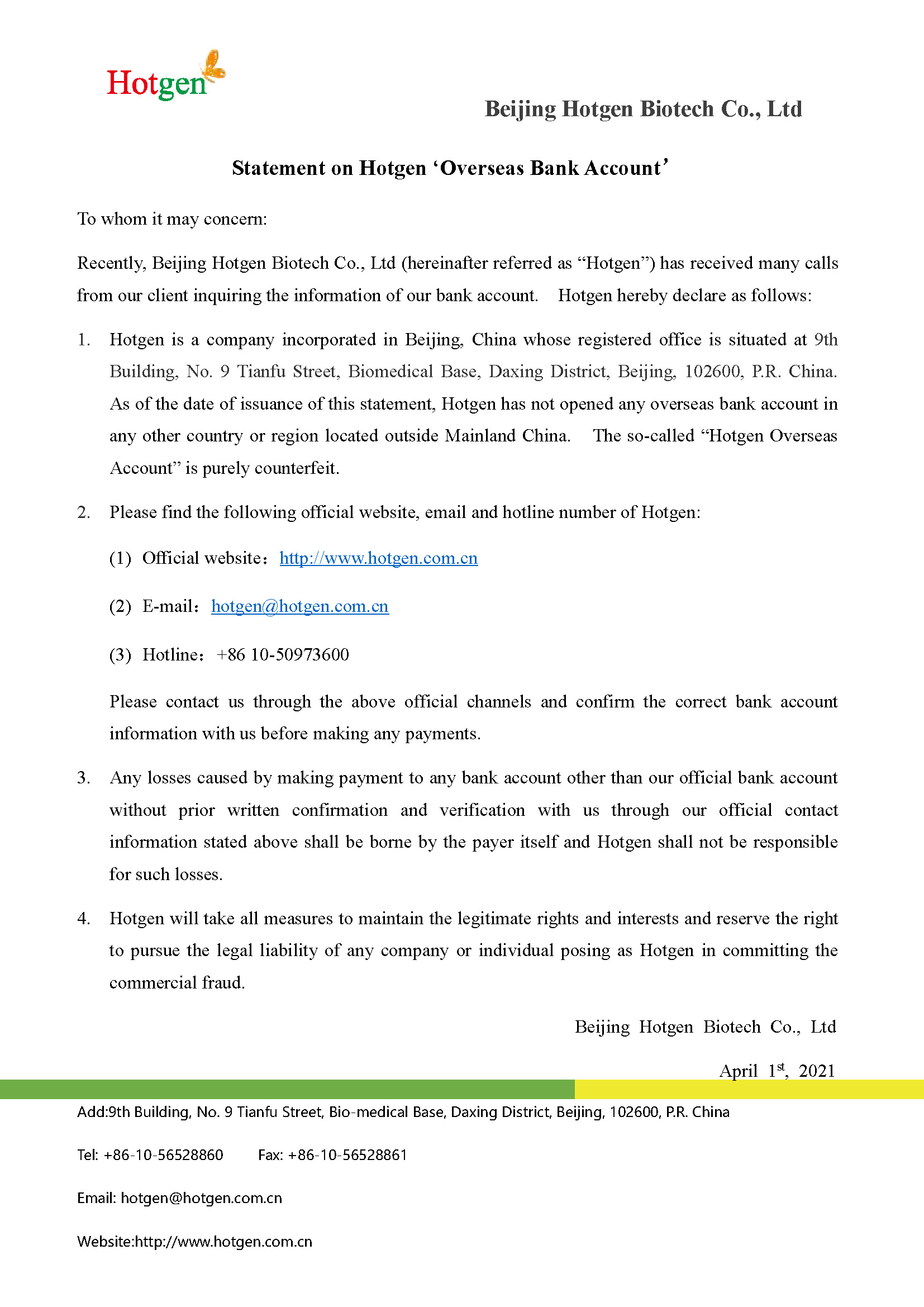 Statement on Hotgen ‘Overseas Bank Account’