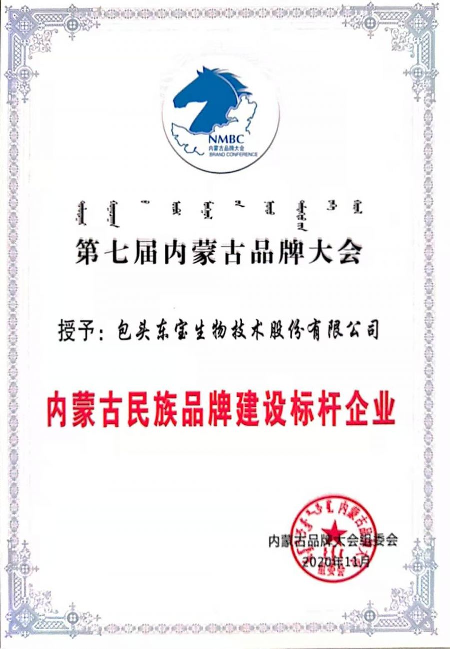 全區(qū)200余家品牌企業(yè)代表及自治區(qū)發(fā)改委、農(nóng)牧廳、工商聯(lián)等單位領導、各大主流媒體記者等300余人參加了大會,會上發(fā)布了“2020年度內蒙古品牌價值評價信息數(shù)據(jù)”和“2020年度內蒙古百強品牌價值評價分析報告”,并向獲得2020年度內蒙古百強(優(yōu)秀、入圍)品牌企業(yè)代表頒發(fā)牌匾、證書。東寶生物分別榮獲《內蒙古百強品牌》和《內蒙古民族品牌標桿企業(yè)》榮譽稱號。