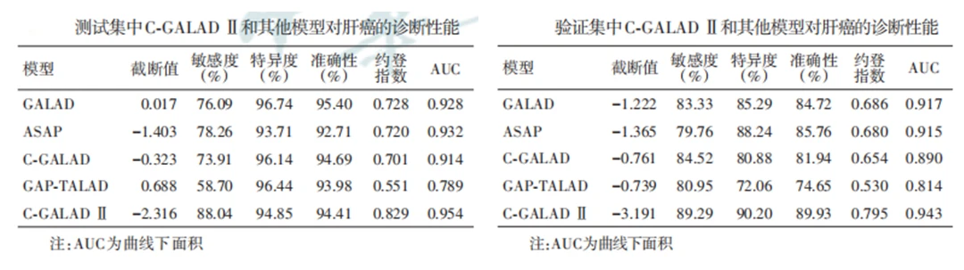 在測試集上驗證C-GALAD Ⅱ所得AUC為 0.954,敏感度為88.04%,特異度為94.85%;在外部獨立驗證集的C-GALAD Ⅱ所得AUC為0.943,敏感度為89.29%,特異度為90.2%,性能優(yōu)于其他已發(fā)表模型。
