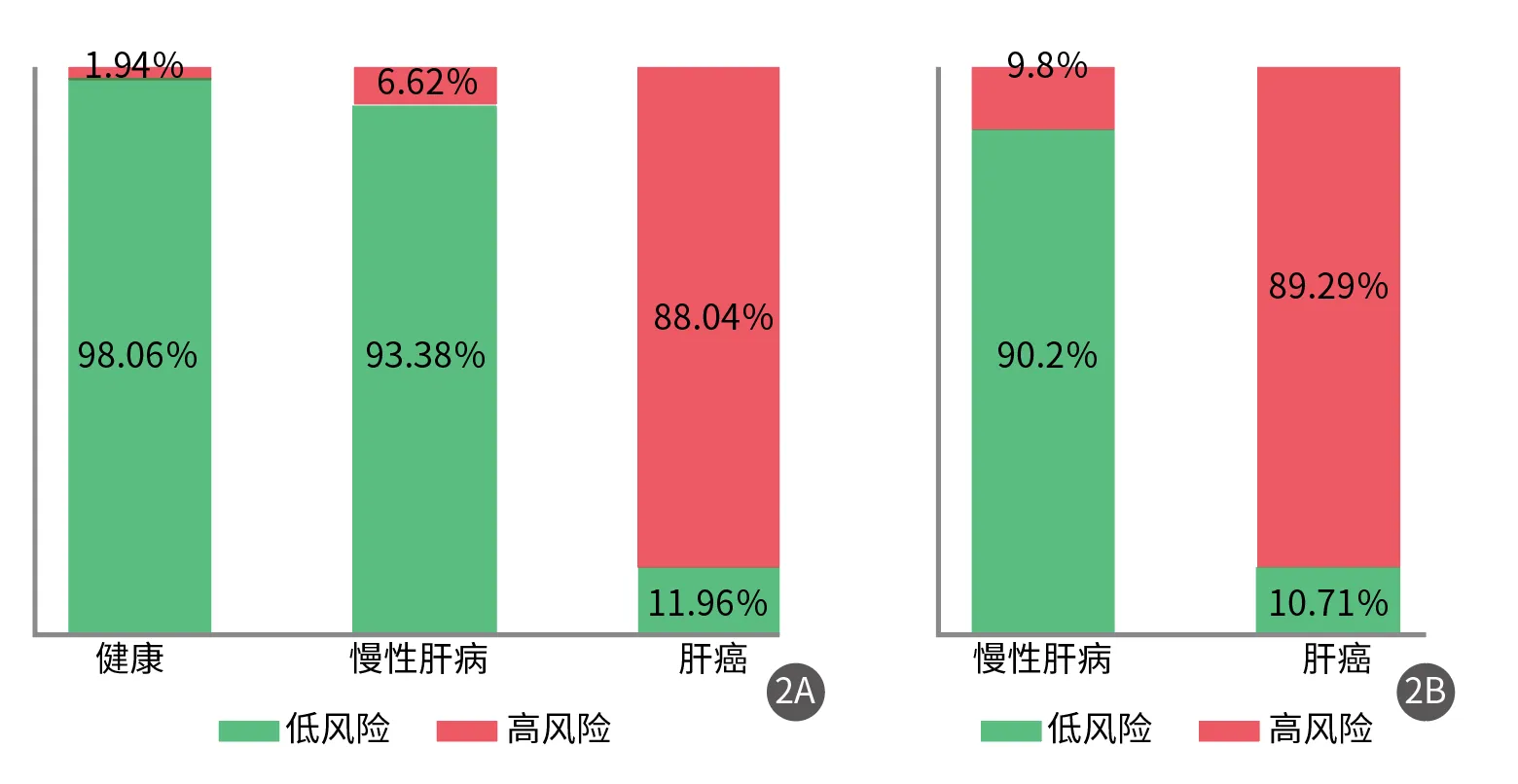 圖2 C-GALAD Ⅱ模型在測試集和驗證集中不同人群的預(yù)測結(jié)果分布(2A為測試集,2B為驗證集)