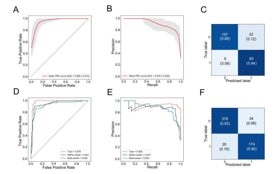 為進(jìn)一步提高模型的診斷性能,我們將miRNA靶標(biāo)與AFP/DCP特征結(jié)合。結(jié)果顯示,結(jié)合后模型的ROC-AUC值提升至0.96,PRAUC值達(dá)到0.91(圖3A-B)。此外,基于該聯(lián)合特征的模型對(duì)194例HCC患者的總體靈敏度達(dá)到90.70%,顯著高于單獨(dú)使用miRNA靶標(biāo)時(shí)的88.06%(圖3C)。這表明miRNA與蛋白特征之間具有互補(bǔ)作用,顯著增強(qiáng)了HCC的診斷準(zhǔn)確性。