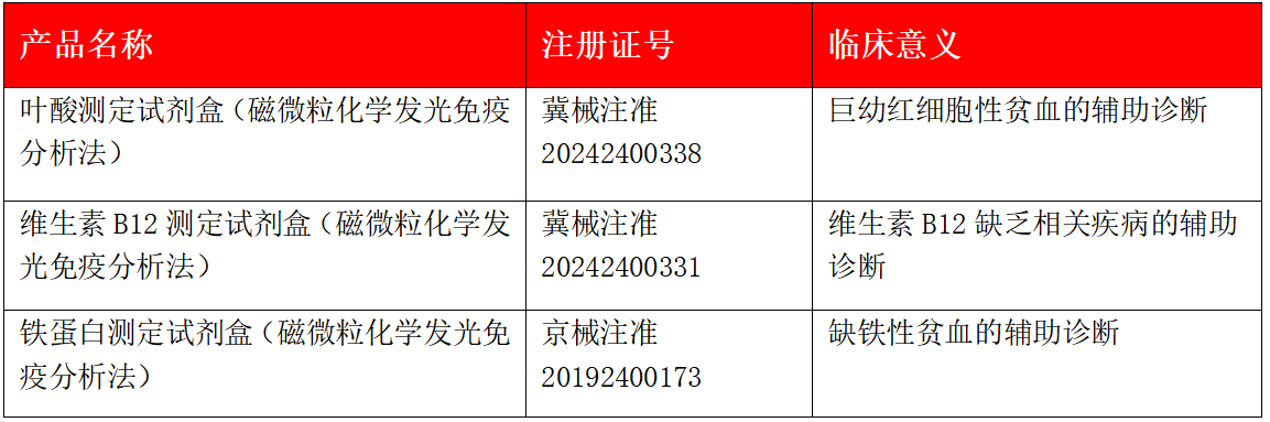 近日,熱景生物研發(fā)的葉酸測定試劑盒(磁微?;瘜W(xué)發(fā)光免疫分析法)、維生素B12測定試劑盒(磁微?;瘜W(xué)發(fā)光免疫分析法),獲得河北省藥品監(jiān)督管理局批準(zhǔn)的醫(yī)療器械注冊證。至此,熱景生物貧血三項(FA、VB12和Ferr)全部獲得注冊證,見表1。