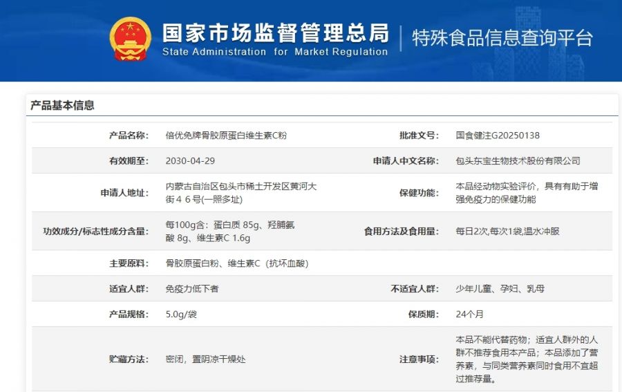 作為深耕膠原60余年的東寶生物推出的膠原+系列產品“倍優(yōu)免牌骨膠原蛋白維生素C粉”(注冊批準證號:國食健注G20250138),正是在這樣的市場背景下孕育而生。本品具有“有助于增強免疫力”的保健功能,可作為亞健康人群、中老年人日常營養(yǎng)補充的選擇,也有助于滿足關注健康管理的青年及職場人士對提升狀態(tài)的需求。
